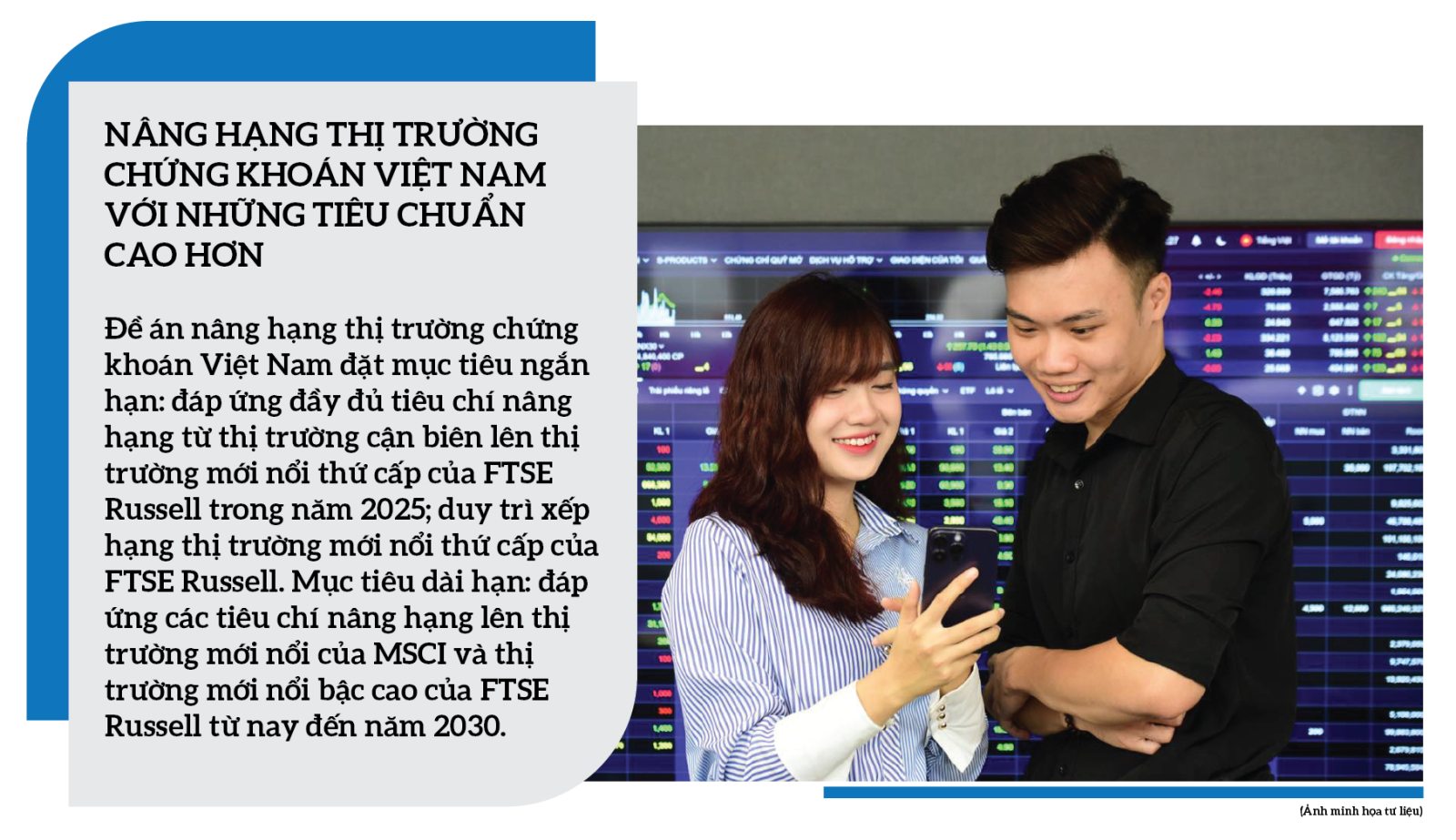 Cùng với hoàn thiện thể chế, việc triển khai Đề án nâng hạng thị trường chứng khoán được xem là chiến lược “đột phá” nhằm thu hút dòng vốn chất lượng cao. Việt Nam hiện vẫn nằm trong nhóm thị trường cận biên theo FTSE Russell, nhưng đã đáp ứng hết tiêu chí để được nâng hạng lên nhóm thị trường mới nổi thứ cấp.