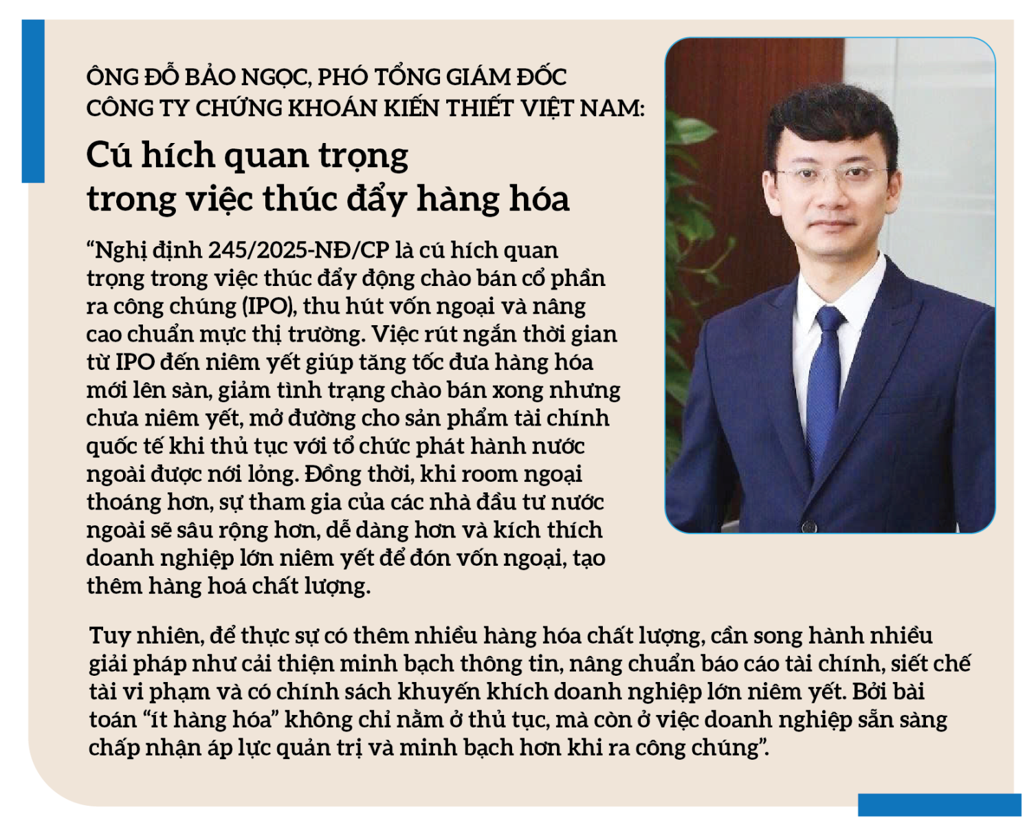 Song hành với mục tiêu đa dạng hóa sản phẩm tài chính, loạt quy định mới cũng đang tạo điều kiện thuận lợi hơn cho doanh nghiệp lên sàn. Đối với hoạt động chào bán cổ phiếu lần đầu ra công chúng (IPO), quy định mới đã giảm thời hạn phải đưa chứng khoán (cổ phiếu, trái phiếu, chứng chỉ quỹ) vào giao dịch từ 90 ngày còn 30 ngày kể từ ngày SGDCK chấp thuận đăng ký niêm yết nhằm đảm bảo tốt hơn quyền lợi nhà đầu tư trong thực hiện các quyền chuyển nhượng chứng khoán.