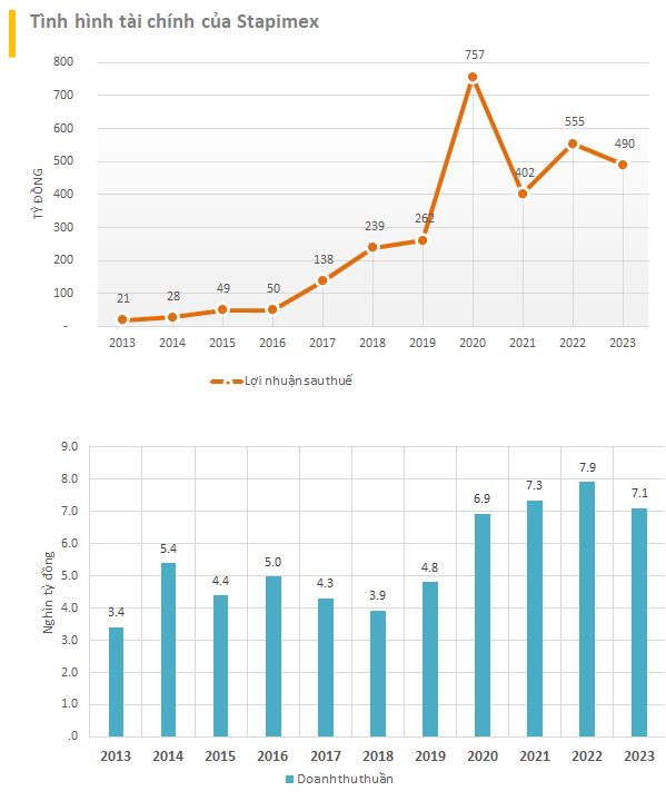 Tính đến cuối năm 2023, vốn điều lệ của Stapimex chỉ vỏn vẹn 77,5 tỷ đồng, vốn chủ sở hữu 2.613 tỷ đồng, được tích lũy trong lợi nhuận sau thuế chưa phân phối (hơn 995 tỷ), thặng dư vốn (hơn 109 tỷ) và Quỹ đầu tư phát triển (1.453 tỷ đồng).