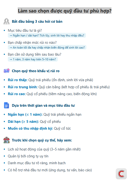 Sau khi xác định được loại quỹ, nhà đầu tư nên tìm hiểu kỹ từng quỹ cụ thể – ưu tiên những quỹ có lịch sử hoạt động tốt, được quản lý bởi công ty uy tín và có danh mục đầu tư rõ ràng, minh bạch. Một số ngân hàng hoặc ứng dụng đầu tư hiện nay cũng hỗ trợ làm bài trắc nghiệm nhanh để xác định khẩu vị rủi ro và gợi ý loại quỹ phù hợp – rất hữu ích cho nhà đầu tư cá nhân.