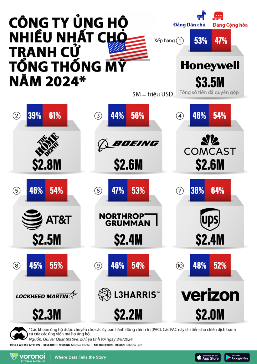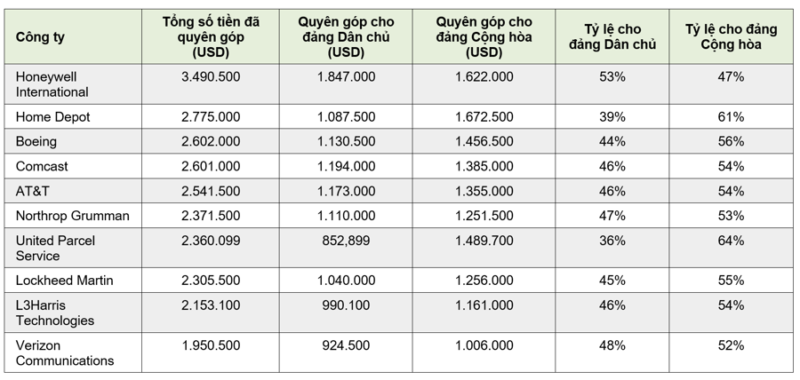 Dù số tiền ủng hộ của top 19 doanh nghiệp cho các PAC ủng hộ ứng viên của đảng Dân chủ hoặc Cộng hòa gần như đều nhau, nhưng trong cuộc bầu cử năm nay, đảng Cộng hòa dành được tỷ lệ quyên góp nhiều hơn từ hầu hết các PAC. Công ty duy nhất có tỷ lệ quyên góp cho ứng viên đảng Dân chủ cao hơn là Honeywell. Đây cũng là công ty có tổng mức quyên góp cao nhất với 3,5 triệu USD. Honeywell là công ty hoạt động trong nhiều lĩnh vực từ công nghệ cho tới sản xuất.