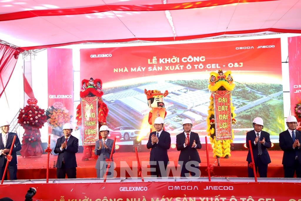 Các đại biểu thực hiện nghi thức khởi công nhà máy sản xuất lắp ráp các mẫu xe Omoda & Jaecoo tại Khu công nghiệp Hưng Phú (xã Hưng Phú, tỉnh Hưng Yên)