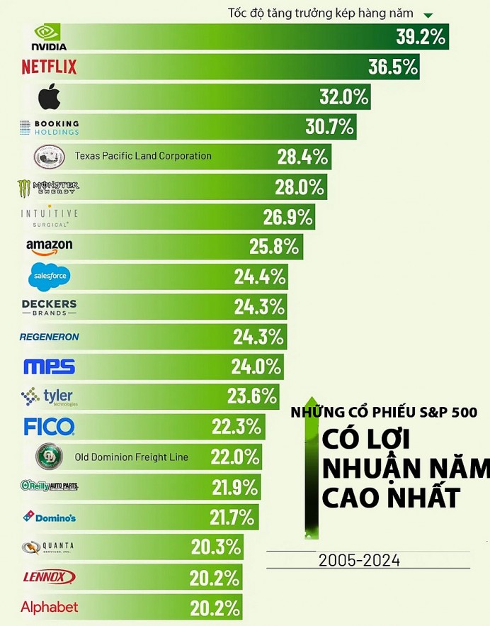 Đồ thị 20 cổ phiếu có tốc độ tăng trưởng kép hàng năm cao nhất trong chỉ số S&P 500 từ năm 2005 - 2024. Nguồn: Ngân hàng Morgan Stanley