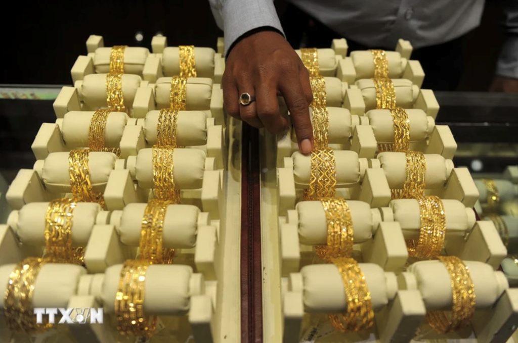 Vàng trang sức được bày bán tại tiệm kim hoàn ở Hyderabad, Ấn Độ. Ảnh: AFP/TTXVN