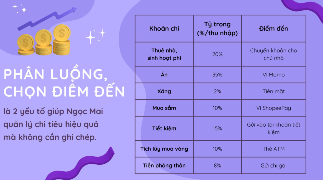 Đây là cách “giữ tiền” của Ngọc Mai (25 tuổi), hiện đang sinh sống và làm việc tại Hà Nội. Sau khi thử gần như tất cả các phương pháp quản lý chi tiêu “ở trên mạng”, Ngọc Mai nhận ra chúng không hiệu quả, nên cô đã tự sáng tạo ra một cách quản lý chi tiêu của riêng mình: Phân luồng và chọn điểm đến cho dòng tiền.