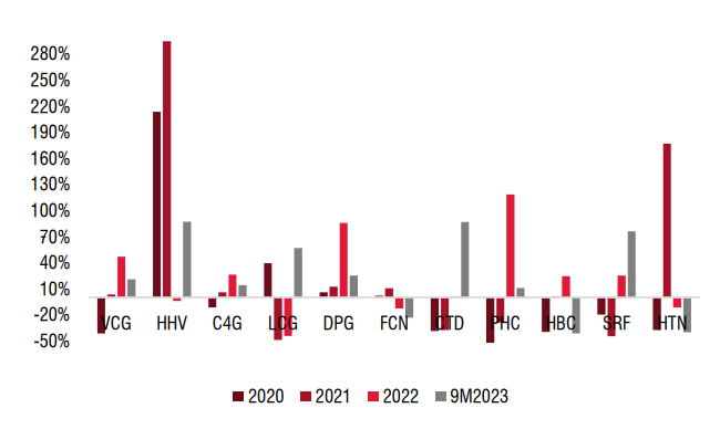 Năm 2023, nhóm các cổ phiếu xây dựng tăng 42%, cao hơn 30% so với mức tăng của chỉ số chính VN-Index. Các cổ phiếu có diễn biến tốt nhất bao gồm CTD (+179%), HHV (+87%) và VCG (+58%). Trong đó, HHV và VCG hoạt động trong lĩnh vực xây dựng hạ tầng đầu tư công - được hưởng lợi cao nhất từ chu kỳ tăng trưởng của đầu tư công, còn CTD ghi nhận lợi nhuận phục hồi mạnh sau giai đoạn tái cơ cấu.
