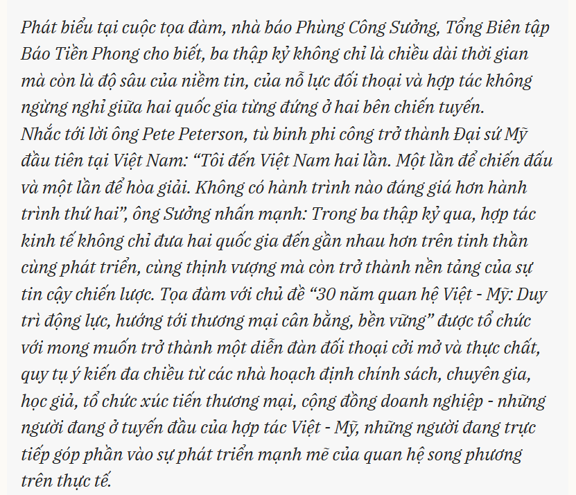 Đại sứ Phạm Quang Vinh, nguyên Thứ trưởng Ngoại giao, nguyên Đại sứ Việt Nam tại Mỹ cho rằng, 30 năm quan hệ Việt – Mỹ là hành trình tăng cường hiểu biết và xây dựng lòng tin. Hành trình 30 năm qua, quan hệ Việt - Mỹ không xuôi chiều, mát mái mà luôn phải vượt qua các khó khăn, thách thức để đạt được như ngày hôm nay. Và qua 30 năm hiện mối quan hệ Việt – Mỹ ngày càng đan xen lợi ích, trên cơ sở đôi bên cùng có lợi.