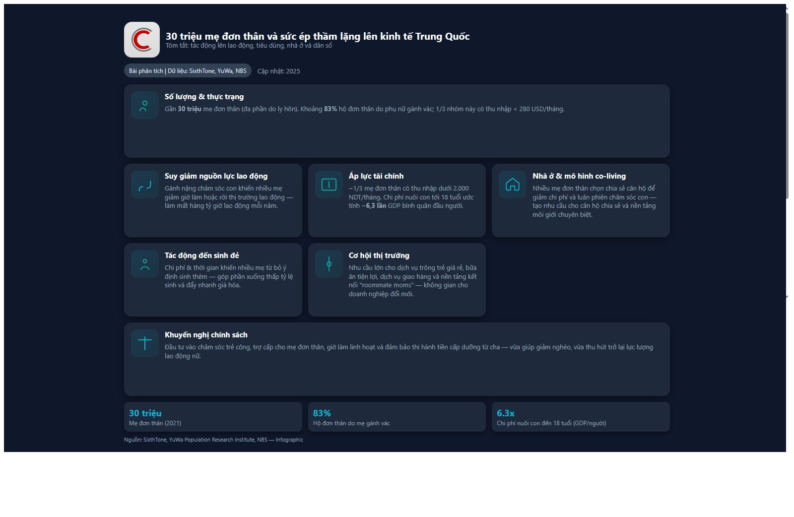 Tờ SixthTone cho hay hàng triệu phụ nữ ở Trung Quốc đang một mình nuôi con. Con số gần 30 triệu vào năm 2021 không chỉ là một vấn đề xã hội mà còn là một lực lượng kinh tế mạnh mẽ, đang thay đổi cách chúng ta nhìn nhận về lao động, tiêu dùng và các mô hình gia đình.