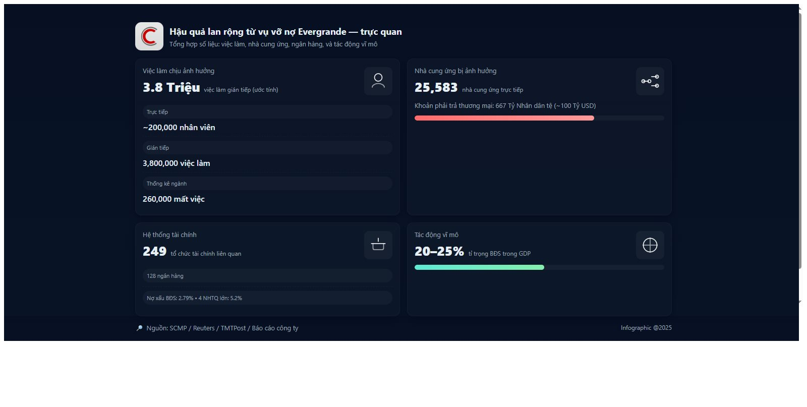 Sự sụp đổ của Tập đoàn Evergrande, từng là gã khổng lồ bất động sản Trung Quốc, không chỉ là một câu chuyện riêng lẻ về quản lý yếu kém mà còn là một "quả bom nợ" đã kích hoạt hiệu ứng domino, gây ra những hậu quả sâu rộng và dai dẳng.