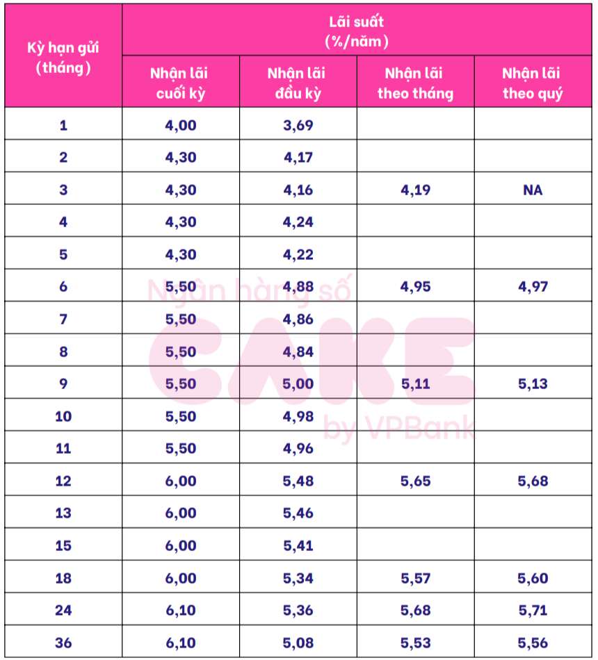 Cake by VPBank đang niêm yết lãi suất cao nhất kỳ hạn 6 tháng ở mức 5,5%/năm khi khách hàng lĩnh lãi cuối kỳ. Ở những kỳ hạn khác, Cake by VPBank niêm yết lãi suất dao động từ 3,7-6,1%/năm.