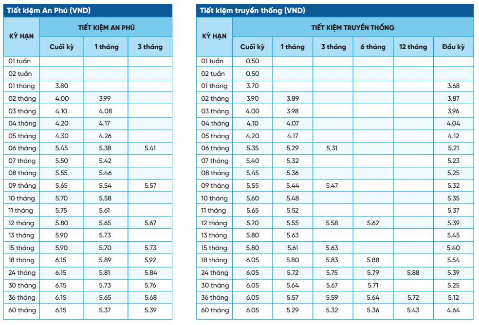 NCB đang niêm yết lãi suất cao nhất kỳ hạn 6 tháng ở mức 5,45%/năm khi khách hàng gửi tiết kiệm An Phú. Nếu khách hàng gửi tiền truyền thống, chỉ nhận lãi suất lần lượt ở mức 5,35%/năm.