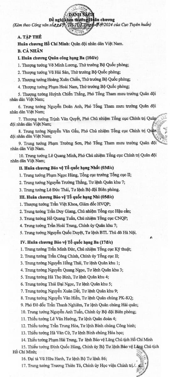 Danh sách các tập thể, cá nhân được đề nghị tặng thưởng Huân chương. Ảnh: Bộ Quốc phòng