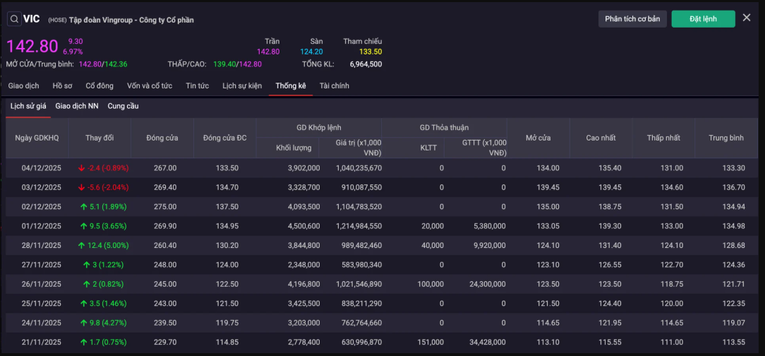 Phiên giao dịch ngày 5/12, cổ phiếu VIC tăng kịch trần lên 142.800 đồng/cp. Đà bứt phá này diễn ra ngay sau khi Tập đoàn Vingroup - Công ty Cổ phần chốt ngày giao dịch không hưởng quyền để nhận cổ phiếu thưởng với tỷ lệ 100%.