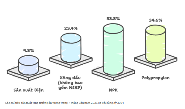 Lũy kế 7 tháng, so với kế hoạch quản trị của Tập đoàn, Petrovietnam có các chỉ tiêu đạt và vượt kế hoạch từ 1 - 10%, gồm: Khai thác dầu thô nước ngoài, xăng dầu không bao gồm NSRP, đạm, NPK, LPG. So với cùng kỳ năm 2024, một số chỉ tiêu tăng trưởng mạnh như sản xuất điện tăng 9,8%, xăng dầu không gồm NSRP tăng 23,4%; NPK tăng 53,8%, Polypropylen tăng 34,6%.