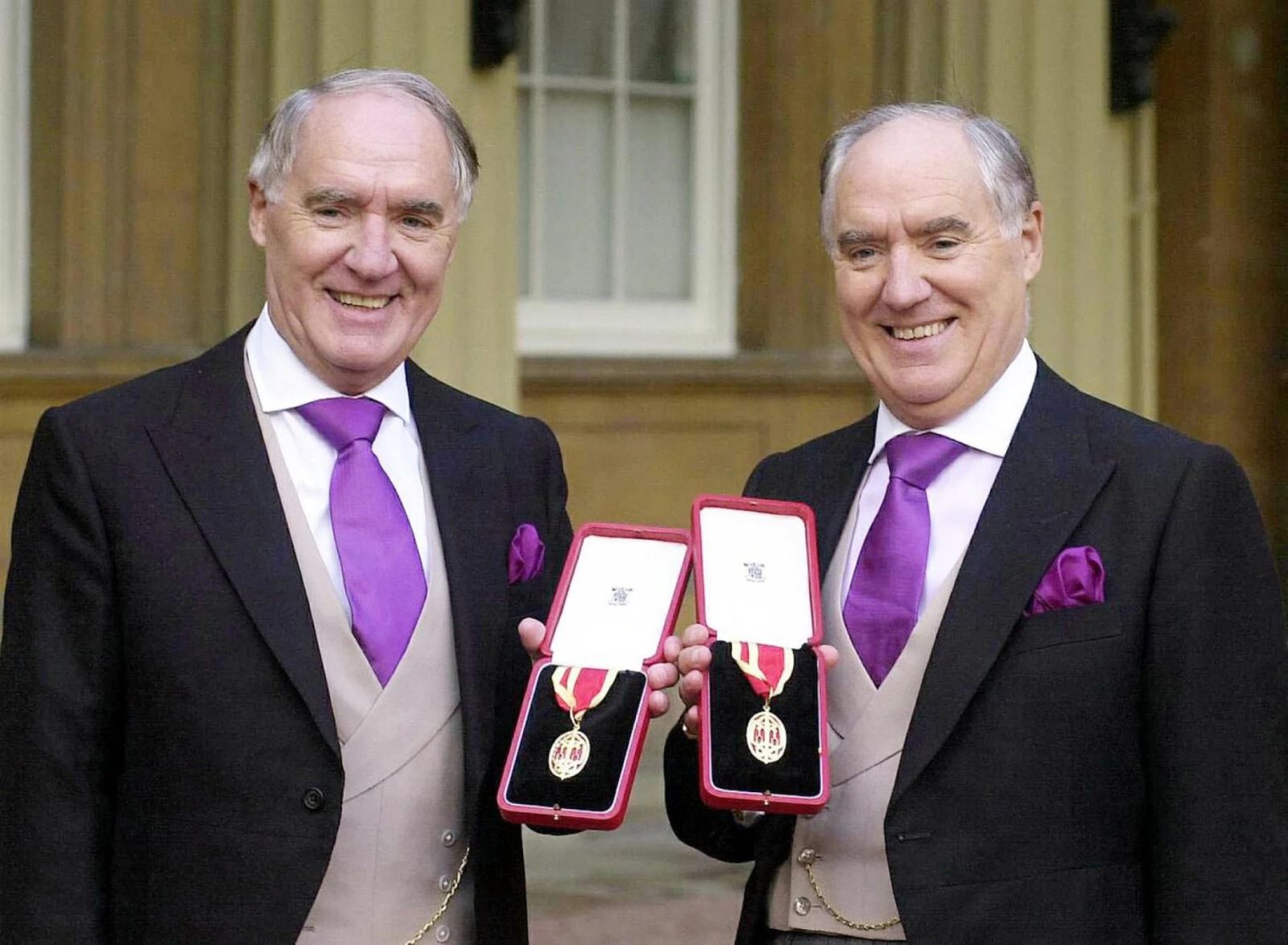 David Barclay (trái) và người anh song sinh Frederick sau khi được Nữ hoàng Anh Elizabeth phong tước hiệp sĩ tại Cung điện Buckingham ở London (Anh), năm 2000. Ảnh: AP.