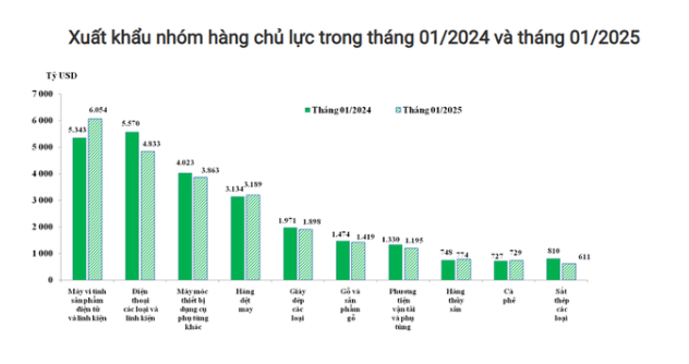 Trị giá xuất khẩu nhóm hàng máy vi tính, sản phẩm điện tử và linh kiện trong tháng 1/2025 đạt 6,05 tỷ USD, giảm 17,4% so với tháng trước và tăng 13,3% so với cùng kỳ năm trước.