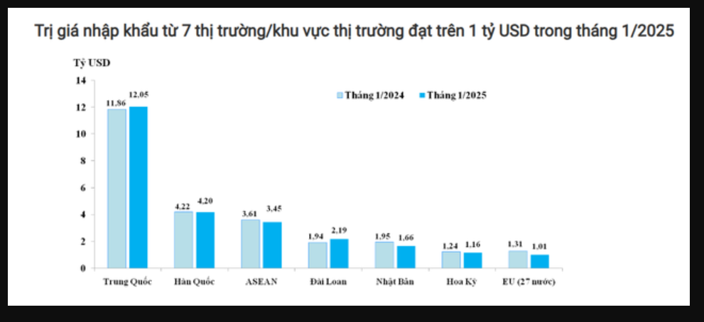 Tháng 1/2025, xuất khẩu có 6 thị trường/khu vực thị trường đạt trên 1 tỷ USD. Trong đó, xuất khẩu sang Hoa Kỳ đạt 10,5 tỷ USD, tăng 4,6%; EU đạt 4,72 tỷ USD, tăng 3,5%; Trung Quốc đạt 3,65 tỷ USD, giảm 19,7%; ASEAN đạt 2,79 tỷ USD, giảm 13,8%; Hàn Quốc đạt 2,2 tỷ USD, giảm 5,5% và Nhật Bản đạt 2,15 tỷ USD, giảm 3,5% so với cùng kỳ năm trước.