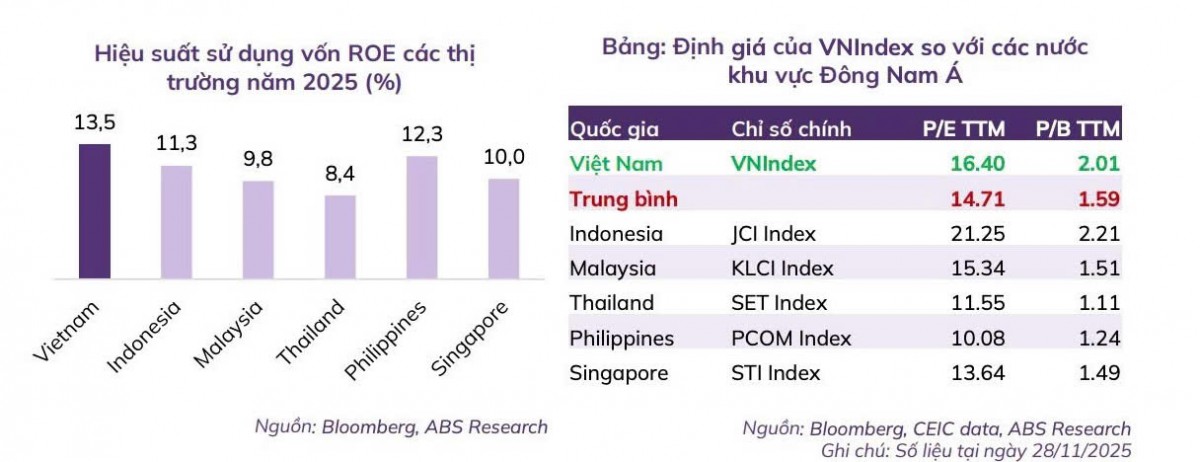 So với các nước trong khu vực Đông Nam Á, VN-Index đang giao dịch với tỷ lệ giá trên thu nhập (P/E) hiện tại là 16,4x, cao hơn trung bình. Dù vậy, với triển vọng tăng trưởng lợi nhuận của VN-Index vẫn ở mức tích cực, tăng trưởng GDP dự báo cao nhất khu vực trong năm 2026, tỷ lệ P/E năm 2026 dự kiến giảm xuống chỉ còn 12,1 - là mức khá hấp dẫn..jpg)
