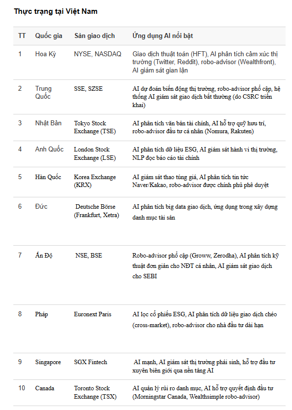 Thực tế, gần như tất cả các thị trường chứng khoán lớn trên thế giới đều đã ứng dụng AI, ít nhất ở một trong các lĩnh vực như: Giao dịch thuật toán, Phân tích dữ liệu lớn, Phân tích cảm xúc thị trường, Giám sát và quản lý rủi ro, ...