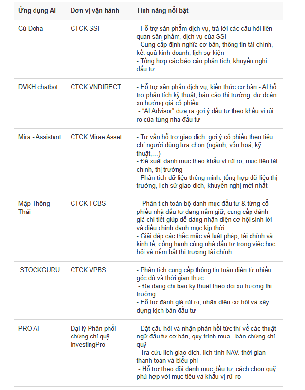 Trước khi ChatGPT ra đời, một số công ty chứng khoán tại Việt Nam đã bắt đầu ứng dụng công nghệ AI vào các hoạt động như giao dịch tự động, phân tích kỹ thuật, hỗ trợ đọc và phân tích báo cáo tài chính.