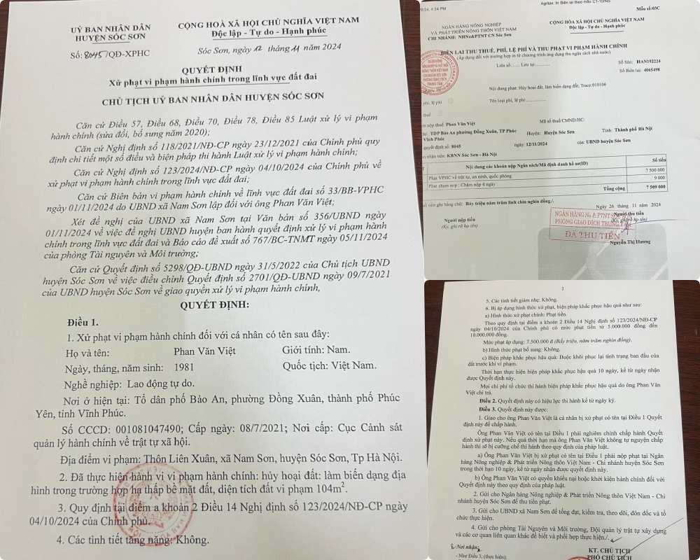 UBND xã Nam Sơn đã báo cáo đề xuất UBND huyện Sóc Sơn ban hành quyết định xử lý vi phạm hành chính. Sau đó, UBND huyện ban hành quyết định về xử phạt vi phạm hành chính trong lĩnh vực đất đai, với số tiền 7,5 triệu đồng.