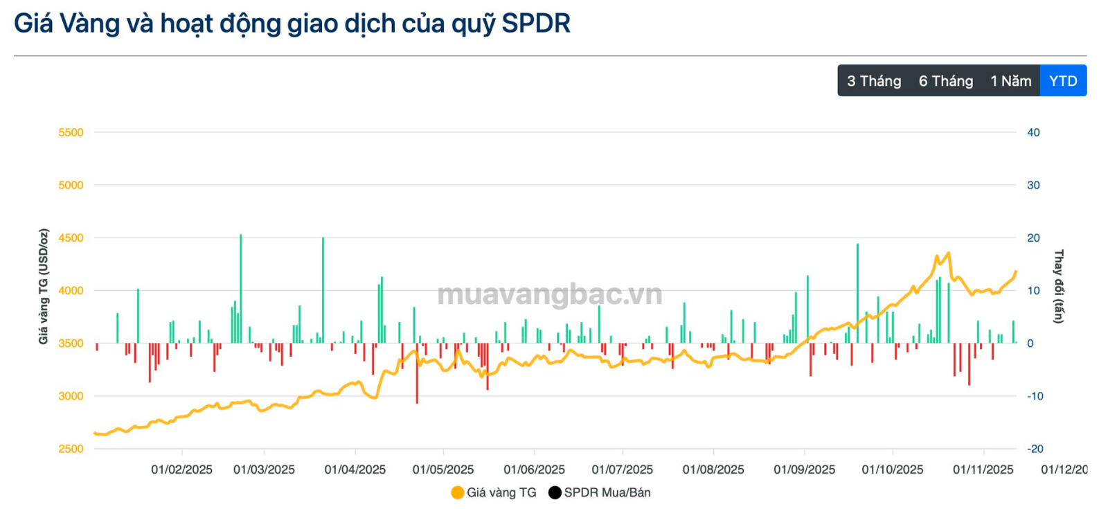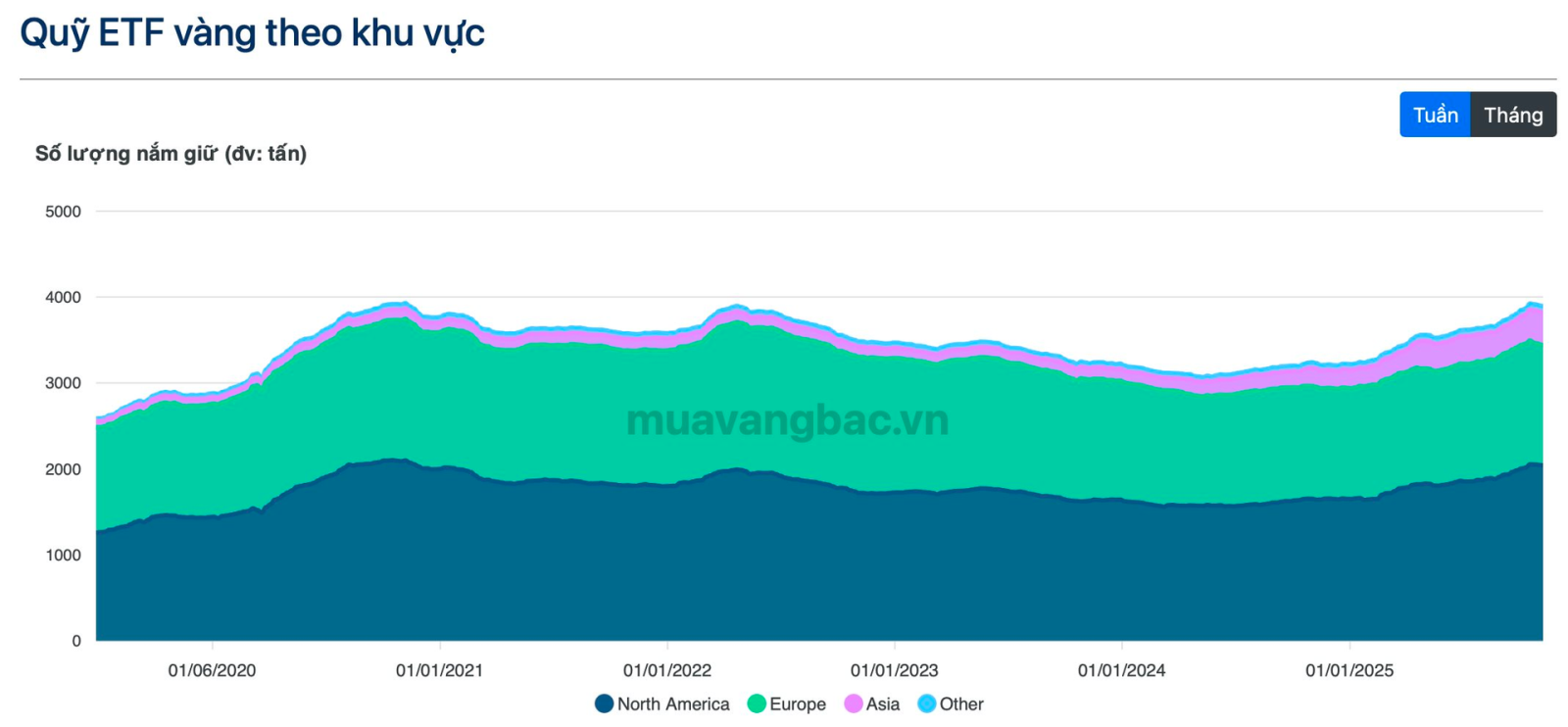 Theo dữ liệu thống kê tính đến cuối tháng 10/2025, tổng lượng vàng nắm giữ bởi các quỹ ETF vàng trên thế giới lên đến gần 3.900 tấn, tương đương mức kỷ lục hồi cuối năm 2020 và đầu 2022. Phần lớn lượng vàng trên được nắm giữ bởi các quỹ đến từ khu vực Bắc Mỹ và Châu Âu.