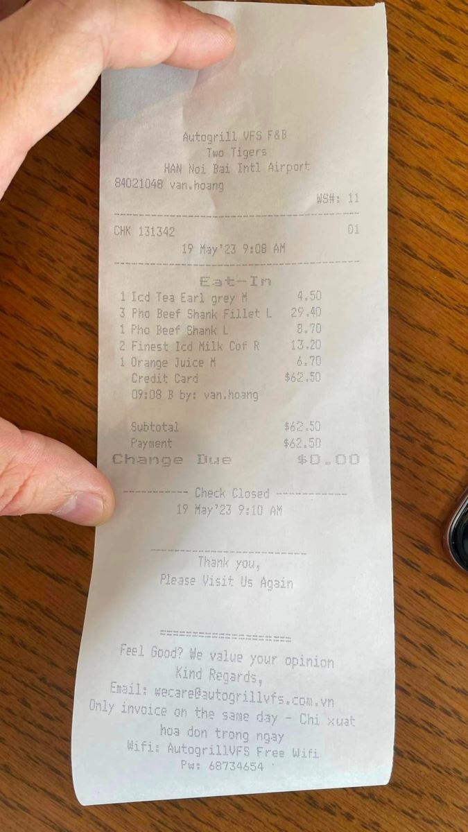 Cụ thể, 3 bát phở bò tái có giá 29,4 USD (tương đương 690.000 đồng), 1 bát phở bò chín có giá 8,7 USD (tương đương 204.000 đồng), 1 cốc trà có giá 4,5 USD (tương đương 105.000 đồng), 2 ly cà phê nâu đá có giá 13,2 USD (tương đương 310.000 đồng), 1 ly nước cam có giá 6,7 USD (tương đương 157.000 đồng).