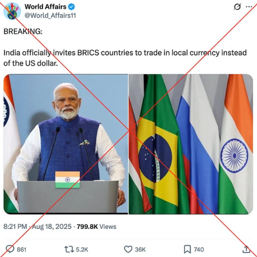 Thông tin này được cho là bắt nguồn từ một bài đăng của tài khoản X World Affairs ngày 18-8, cho biết Ấn Độ đã mời các nước BRICS+ (gồm Brazil, Trung Quốc, Ai Cập, Ethiopia, Indonesia, Iran, Nga, Nam Phi, UAE) chuyển sang giao dịch bằng đồng nội tệ nhằm tránh sử dụng đồng USD.