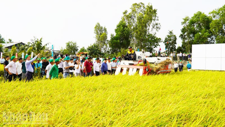 Nông dân tham quan thu hoạch lúa từ Đề án 1 triệu ha lúa chất lượng cao của Hợp tác xã Vinacam, ở xã Hòn Đất, tỉnh An Giang.