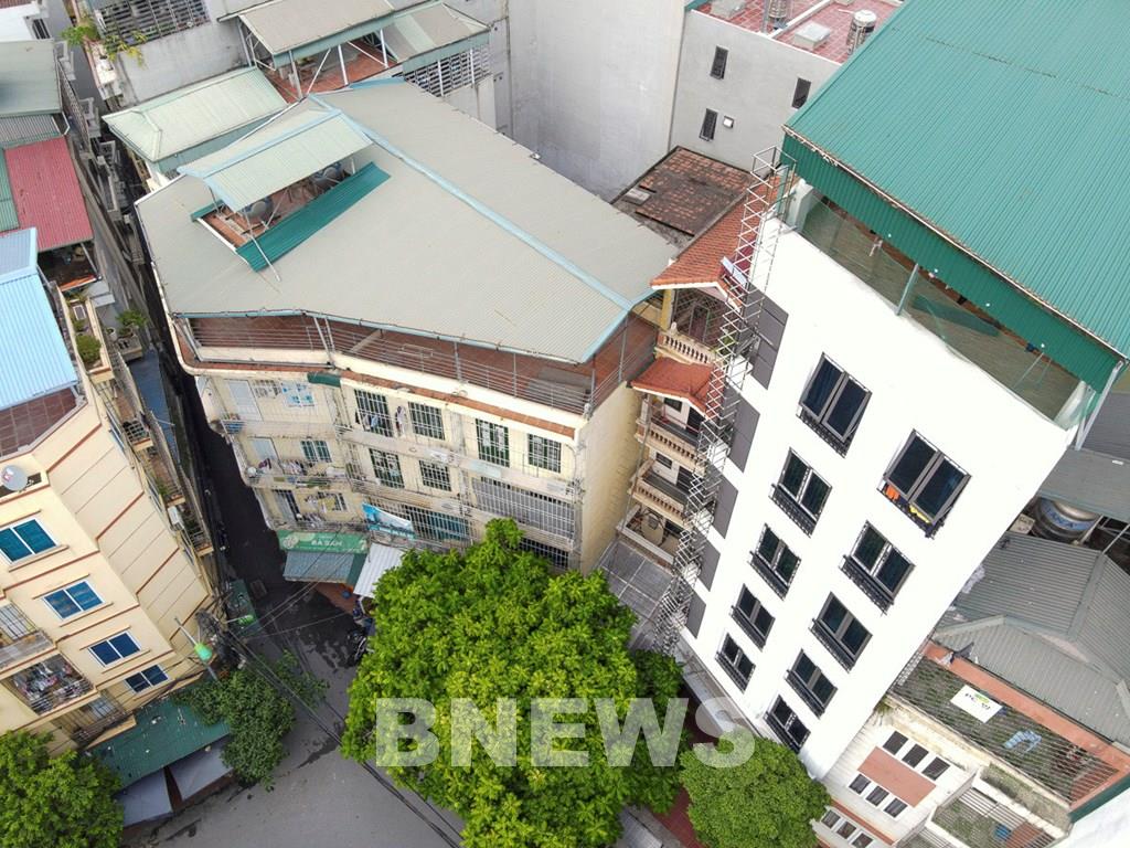 "Chung cư mini” 9 tầng (sơn màu trắng) tại Hà Nội lắp đặt thang thoát hiểm dạng thẳng đứng phòng chống cháy, nổ. Ảnh: Minh Nghĩa/TTXVN