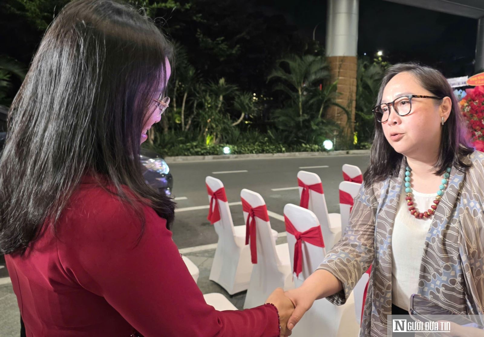 Bà Nguyễn Thị Anh Thi, Phó Chủ tịch UBND thành phố Đà Nẵng, trao đổi với bà Jane Runkat, đại diện Đại sứ quán Indonesia tại Việt Nam, bên lề chương trình chào mừng các chuyến bay mới.