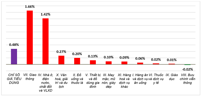 Trong mức tăng 0,48% của CPI tháng 6/2025 so với tháng trước, có 10 nhóm hàng hóa và dịch vụ có chỉ số giá tăng. Trong đó, nhóm giao thông tăng mạnh nhất với 1,66%, tác động làm CPI chung tăng 0,16 điểm phần trăm.