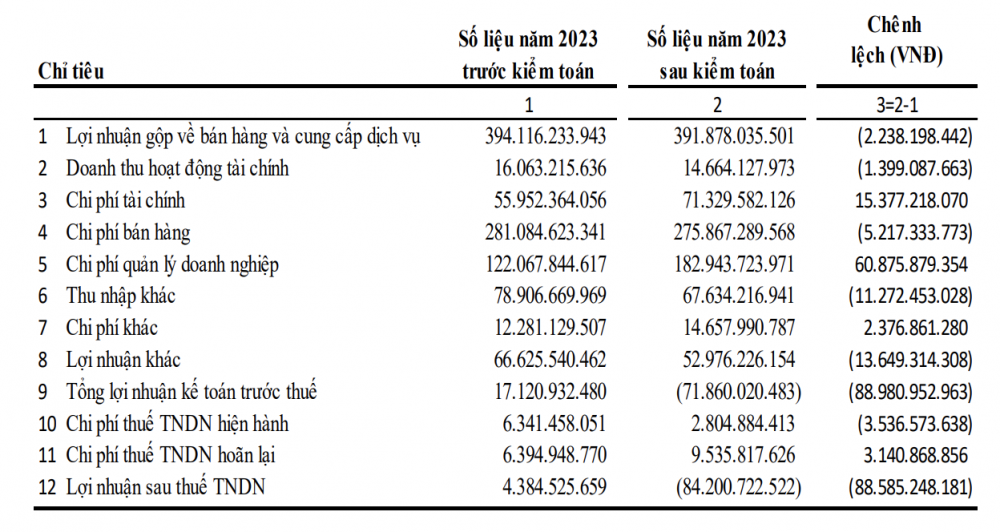 Chỉ tiêu thay đổi đáng kể trước và sau kiểm toán năm 2023
