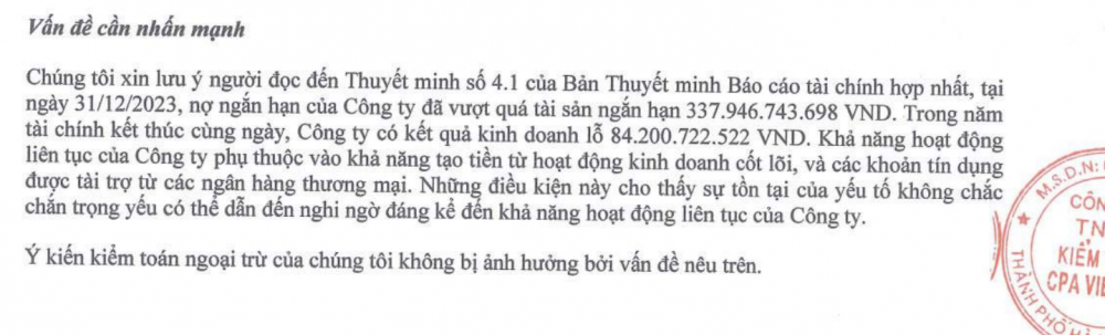 Ngoài ý kiến ngoại trừ, Kiểm toán CPA Việt Nam cũng nêu lên vẫn đề cần nhấn mạnh đó là tại thuyết minh số 4.1 của BCTC hợp nhất năm 2023, nợ ngắn hạn của Tập đoàn Dầu khí AnPha đã vượt quá tài sản ngắn hạn 337,9 tỷ đồng.