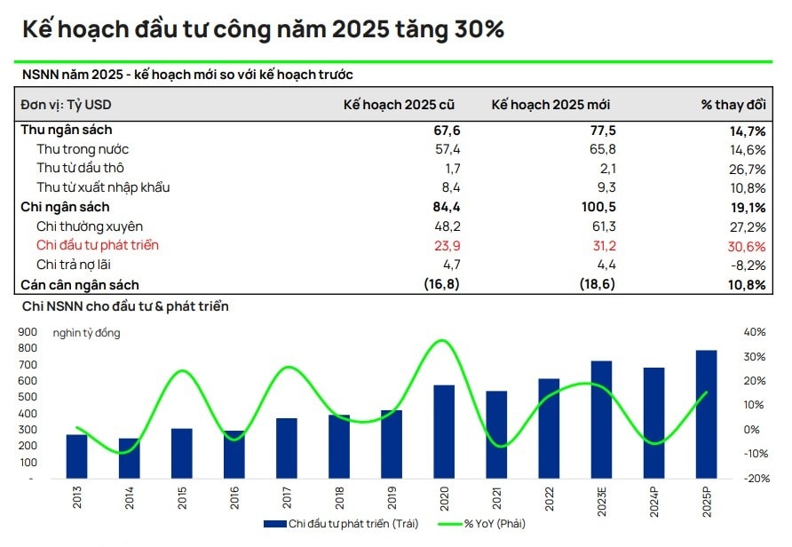 Ông Hoàng Nam cũng nhấn mạnh, Việt Nam đẩy mạnh chi Ngân sách Nhà nước cho phát triển cơ sở hạ tầng. Việc tăng 30% kế hoạch đầu tư công năm 2025, cùng với các mục tiêu tăng trưởng đầy tham vọng của Chính phủ trong những năm tới, được kỳ vọng sẽ thúc đẩy nhu cầu đáng kể đối với vật liệu, kỹ thuật và dịch vụ xây dựng. Cơ sở hạ tầng và kết nối giao thông được cải thiện cũng sẽ hỗ trợ phát triển bất động sản trong trung hạn.