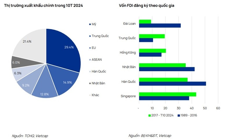 Ông Hoàng Nam - Giám đốc Phòng Nghiên cứu và Phân tích Vietcap nhận định, nguy cơ áp thuế quan cao hơn từ chính quyền "Trump 2.0" là rủi ro lớn đối với Việt Nam, do xuất khẩu hàng hóa chiếm khoảng 90% GDP, trong đó 30% đến từ thị trường Mỹ trong 9 tháng đầu năm 2024. Tuy nhiên, mối đe dọa của Tổng thống Trump về việc áp thuế cao hơn với Trung Quốc so với các quốc gia khác có thể giúp Việt Nam tăng thị phần nhập khẩu tại Mỹ và gia tăng giá trị gia tăng trong chuỗi sản xuất toàn cầu. Theo đó, Vietcap đặt ra 3 kịch bản và những tác động tiềm năng từ chính sách thuế quan của ông Trump.