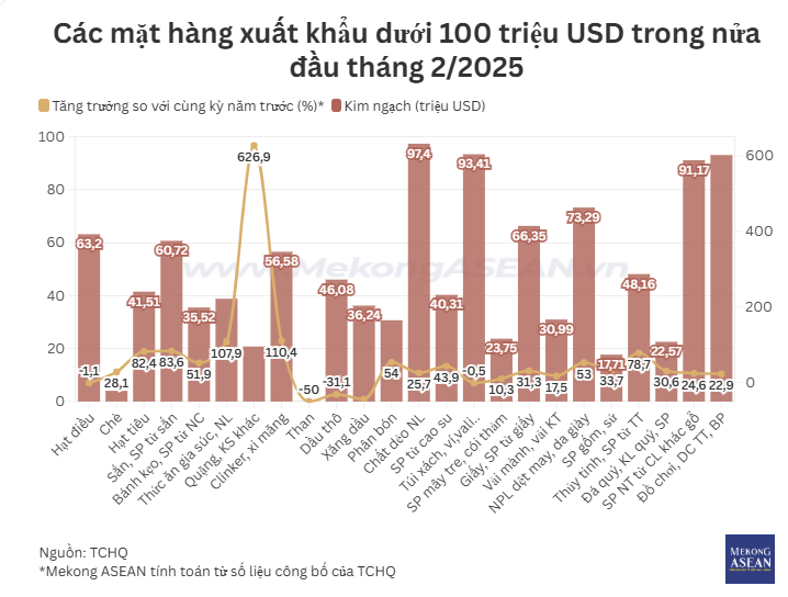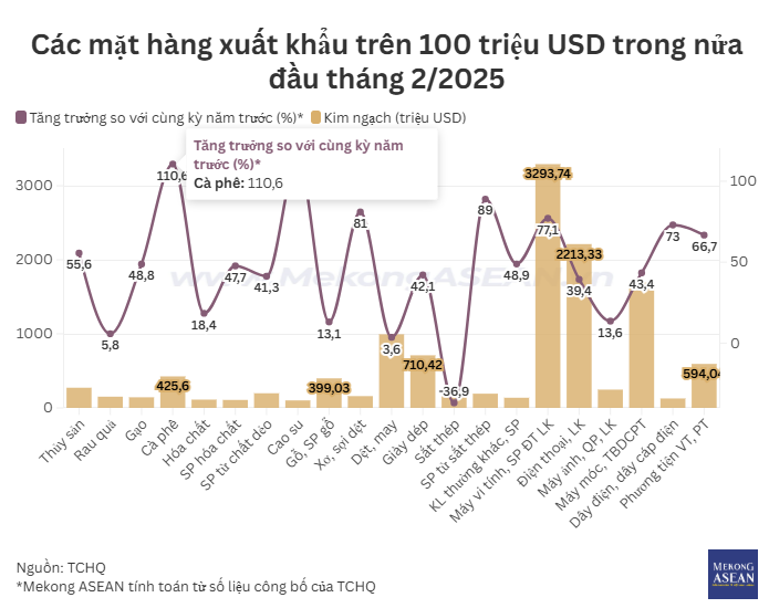 Nửa đầu tháng 2/2025, Việt Nam có 6 mặt hàng giảm và 39 mặt hàng tăng về giá trị xuất khẩu so với cùng kỳ năm trước. Ngoài các mặt hàng nêu trên, một số mặt hàng khác có đà tăng trưởng cao còn bao gồm clinker và xi măng với +110% YoY; quặng và khoáng sản khác với +626% YoY; thức ăn gia súc và nguyên liệu với +107% YoY; thủy tinh, sản phẩm từ thủy tinh với +78% YoY…