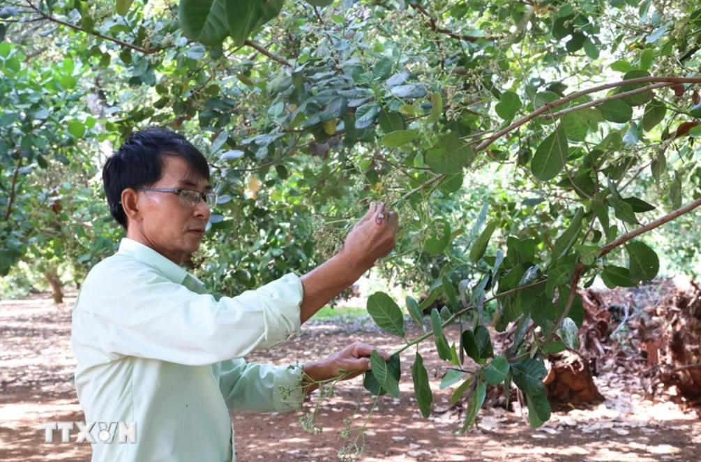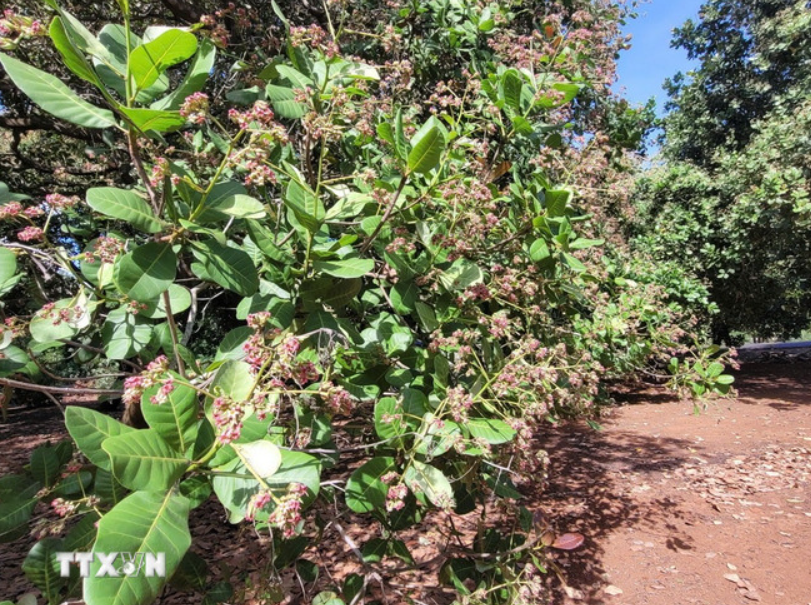 Nhiều vườn điều trên địa bàn xã Hòa Hưng (Xuyên Mộc, Bà Rịa-Vũng Tàu) hiện vẫn đang ra hoa và kết trái non, dự kiến phải đến tháng 4 mới cho thu hoạch. (Ảnh: Hoàng Nhị/TTXVN)