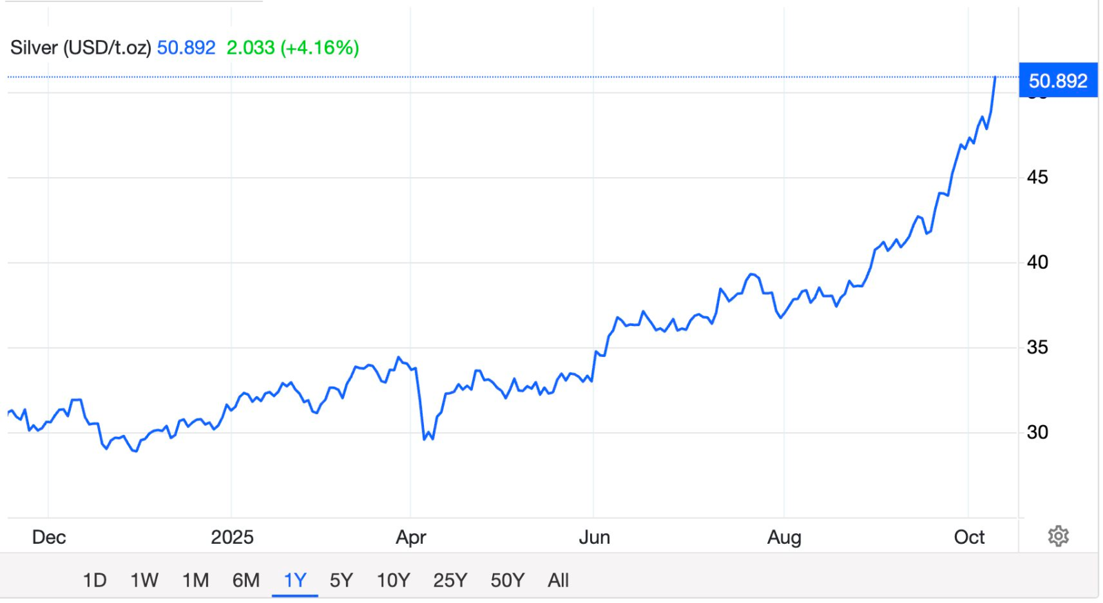 Hầu hết các kim loại chính khác, ngoài bạch kim, đều không thể vượt qua mức tăng của bạc trong năm nay. Sự tăng giá của bạc bắt nguồn từ nhu cầu công nghiệp bùng nổ. Bạc được sử dụng trong mọi thứ, từ tấm pin mặt trời đến chất bán dẫn liên quan đến trí tuệ nhân tạo. Ngoài ra còn có một dòng tiền an toàn chảy vào bạc giai đoạn này khi các nhà đầu tư cho rằng giao dịch vàng quá đông đúc.