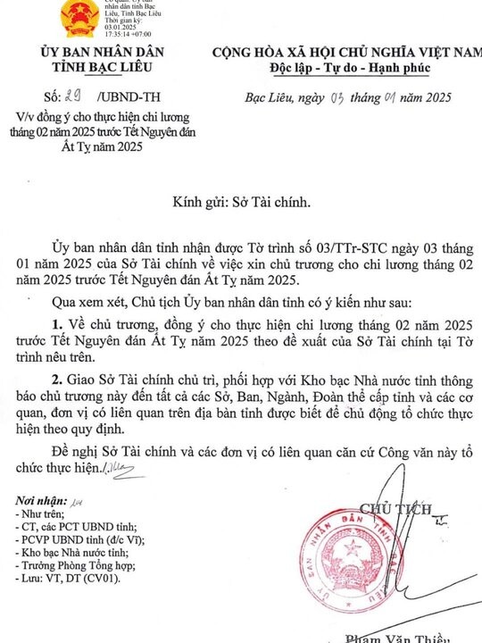 Trước đó, ngày 3.1, Sở Tài chính tỉnh Bạc Liêu có tờ trình xin chủ trương về việc chi trả lương tháng 2.2025. Theo Sở Tài chính tỉnh Bạc Liêu lịch nghỉ Tết Nguyên đán Ất Tỵ 2025 từ ngày 25.1 đến ngày 2.2 dương lịch, làm việc lại bình thường vào ngày 3.2.