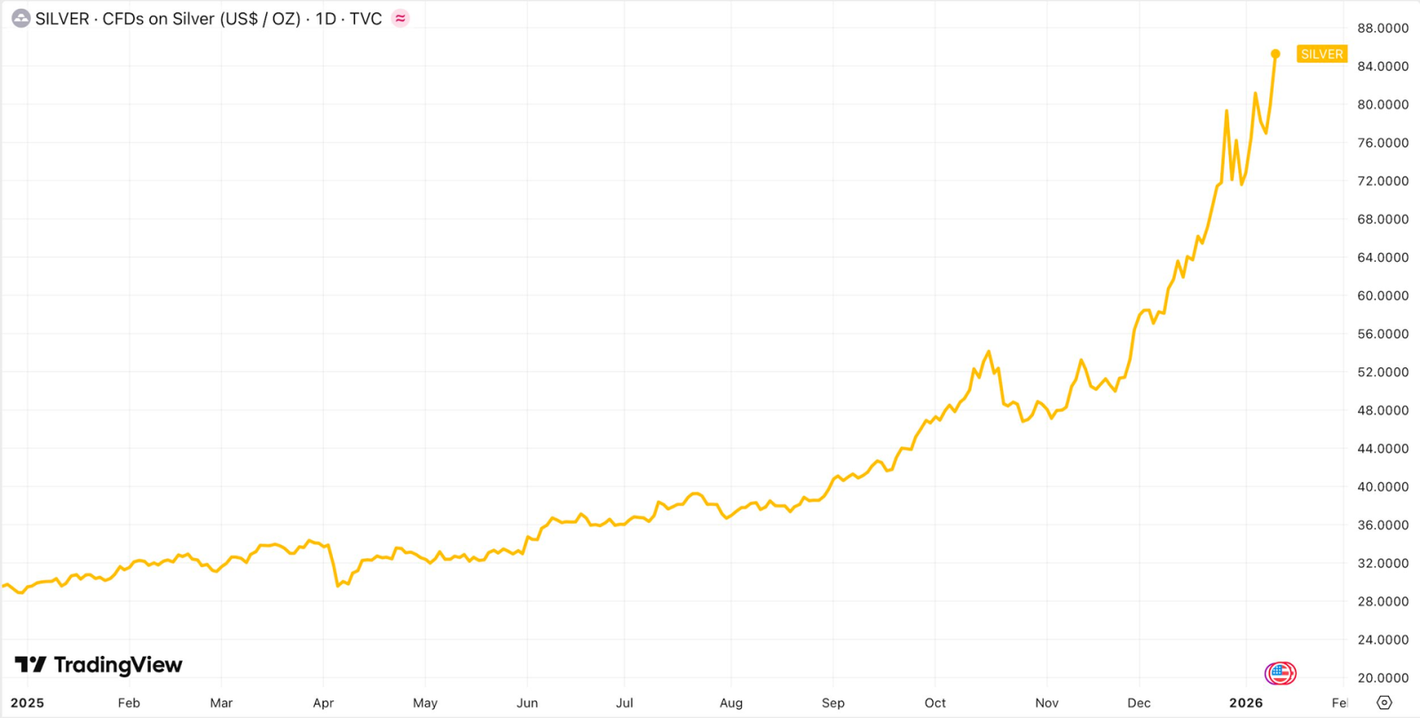 Cơn sốt bạc trên toàn cầu chưa hề có dấu hiệu hạ nhiệt dù đã tăng 150% trong năm 2025. Ngày 12/1, giá bạc có thời điểm tăng đến 7% vượt mốc 85 USD/oz, lập kỷ lục mới. Giá bạc tăng phi mã đẩy vốn hóa thị trường lên trên 4.700 tỷ USD, (theo ước tính của CoinMarketCap), vượt vượt qua NVIDIA, Google, Apple để trở thành tài sản có giá trị lớn thứ 2 thế giới, chỉ sau vàng.