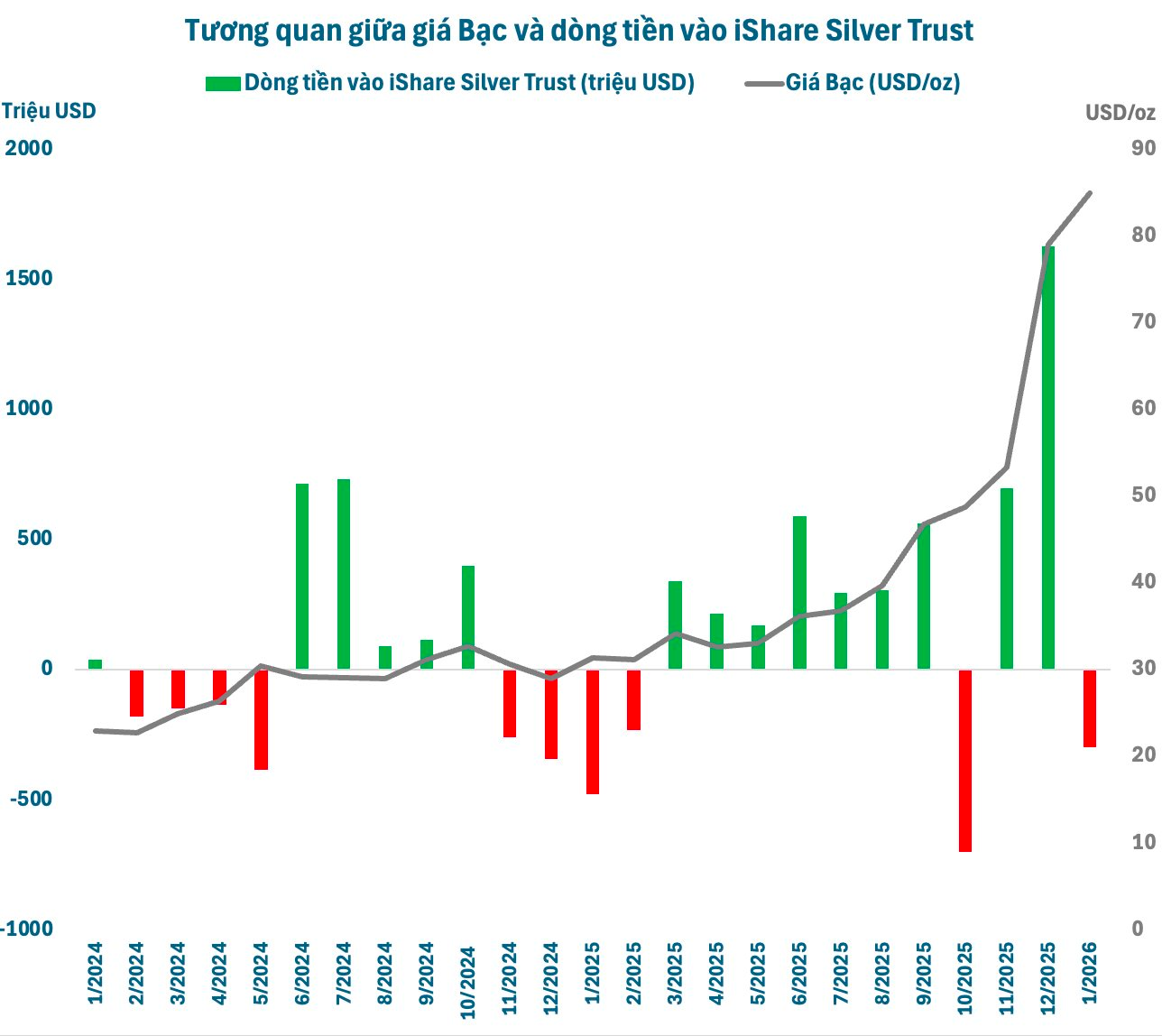 Một trong những động lực thúc đẩy giá bạc còn đến từ động thái trở lại mua mạnh của các cá mập. Quỹ bạc lớn nhất thế giới iShare Silver Trust (SLV) do BlackRock quản lý đã chi hơn 500 triệu USD để mua bạc trong 2 ngày gần nhất. Động thái này đã thu hẹp mức bán ròng từ đầu năm xuống còn chưa đến 400 triệu USD. Trong năm 2025 trước đó, quỹ đã chi đến 3,4 tỷ USD để mua bạc.