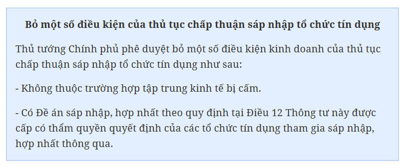 Đồng thời, Thủ tướng Chính phủ cũng phê duyệt cắt giảm, đơn giản hóa điều kiện kinh doanh trong 5 lĩnh vực: hoạt động kinh doanh của NHTM; hoạt động kinh doanh của tổ chức tín dụng phi ngân hàng; hoạt động kinh doanh của ngân hàng hợp tác xã, quỹ tín dụng nhân dân, tổ chức tài chính vi mô; cung ứng dịch vụ trung gian thanh toán, cung ứng dịch vụ thanh toán qua tài khoản thanh toán của khách hàng; cung ứng dịch vụ thông tin tín dụng.