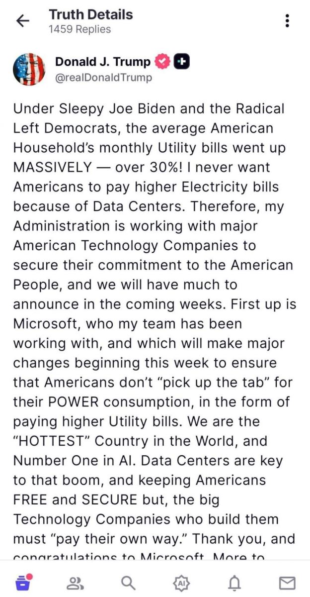 Thông điệp đáng chú ý của ông Trump về giá điện và vai trò của các công ty công nghệ (Ảnh chụp màn hình)