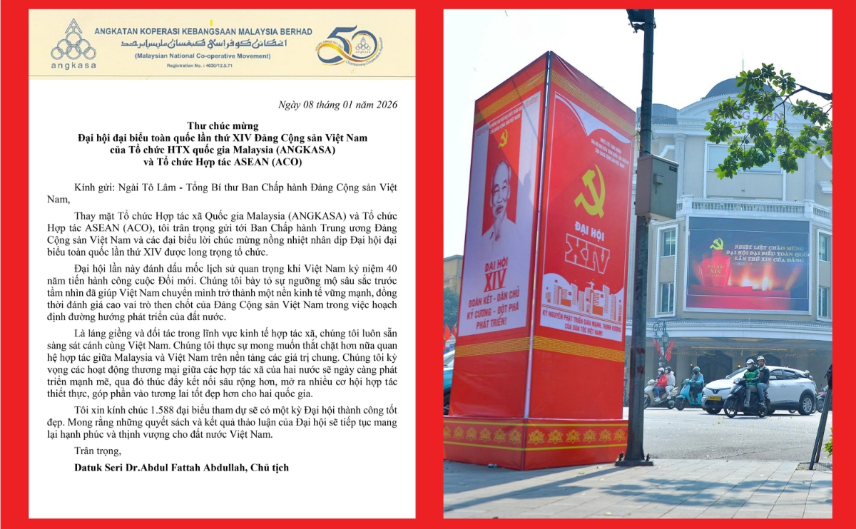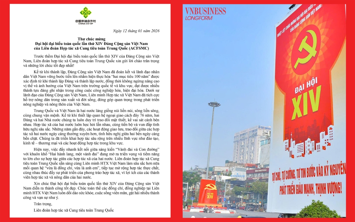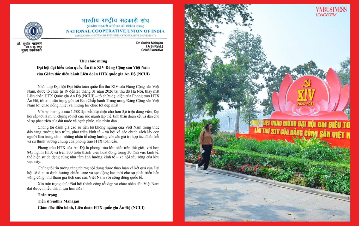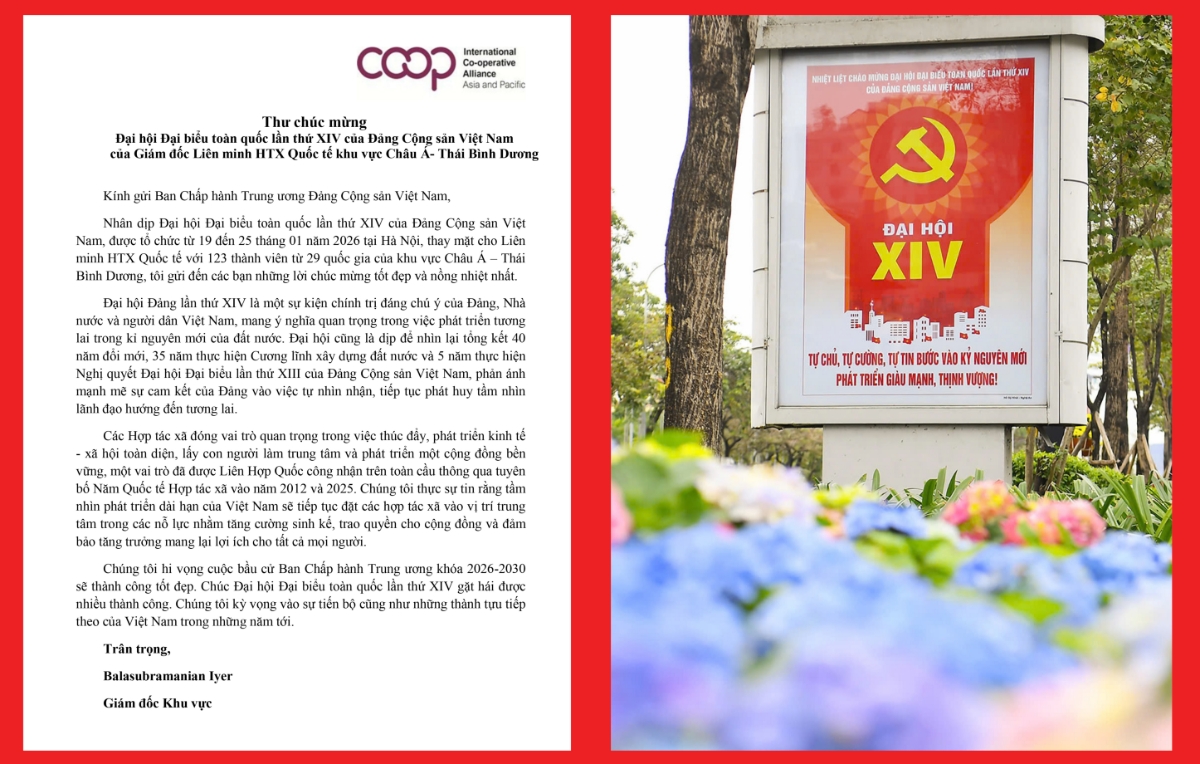 Trong thư chúc mừng gửi Đại hội XIV, ông Balu Iyer – Giám đốc khu vực châu Á – Thái Bình Dương của Liên minh Hợp tác xã Quốc tế (ICA-AP) – nhấn mạnh Đại hội là sự kiện chính trị có ý nghĩa đặc biệt đối với Đảng, Nhà nước và Nhân dân Việt Nam, không chỉ hoạch định tương lai đất nước trong kỷ nguyên mới mà còn là dịp tổng kết chặng đường 40 năm đổi mới, 35 năm thực hiện Cương lĩnh xây dựng đất nước và 5 năm triển khai Nghị quyết Đại hội XIII.
