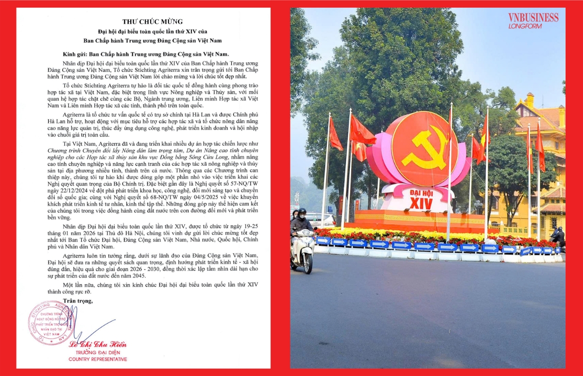 Tổ chức Stichting Agriterra (Hà Lan) khẳng định cam kết đồng hành cùng Việt Nam trong phát triển hợp tác xã nông nghiệp và thủy sản, đặc biệt thông qua các chương trình nâng cao quản trị, ứng dụng công nghệ và hội nhập chuỗi giá trị. Agriterra đánh giá cao các Nghị quyết mới của Đảng về khoa học – công nghệ, đổi mới sáng tạo, kinh tế tập thể và tin tưởng Đại hội XIV sẽ tiếp tục định hướng đúng đắn cho phát triển bền vững dài hạn.