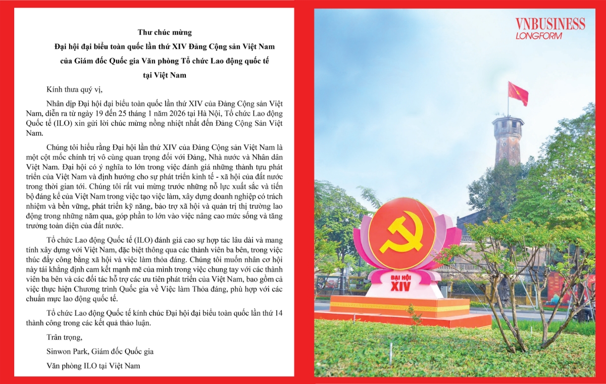 Tổ chức Lao động Quốc tế (ILO), thông qua Giám đốc Quốc gia Sinwon Park, khẳng định Đại hội XIV là cột mốc chính trị đặc biệt quan trọng, có ý nghĩa định hướng phát triển kinh tế – xã hội của Việt Nam trong giai đoạn tới. ILO ghi nhận và đánh giá cao những nỗ lực nổi bật của Việt Nam trong tạo việc làm bền vững, phát triển doanh nghiệp có trách nhiệm, nâng cao kỹ năng lao động, mở rộng an sinh xã hội và cải thiện quản trị thị trường lao động.