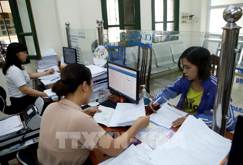 Nhân viên Bảo hiểm xã hội tỉnh Hưng Yên hướng dẫn người dân làm thủ tục tham gia Bảo hiểm xã hội. Ảnh: Phạm Kiên - TTXVN