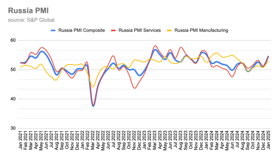 Theo dữ liệu mới nhất từ S&P Global, chỉ số PMI ngành dịch vụ của Nga đã tăng lên 54,6 điểm trong tháng 1/2025, so với 51,2 điểm của tháng 12/2024, cho thấy tốc độ mở rộng nhanh nhất trong vòng một năm. Báo cáo của S&P Global cho biết sự tăng trưởng này đến từ sự gia tăng ổn định của đơn đặt hàng mới và điều kiện nhu cầu thuận lợi hơn.