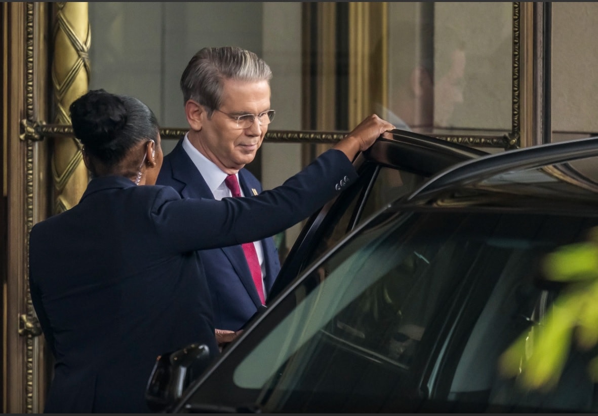 Bộ trưởng Tài chính Mỹ Scott Bessent rời khách sạn để đi gặp phái đoàn Trung Quốc ngày 10.5 ẢNH: AFP
